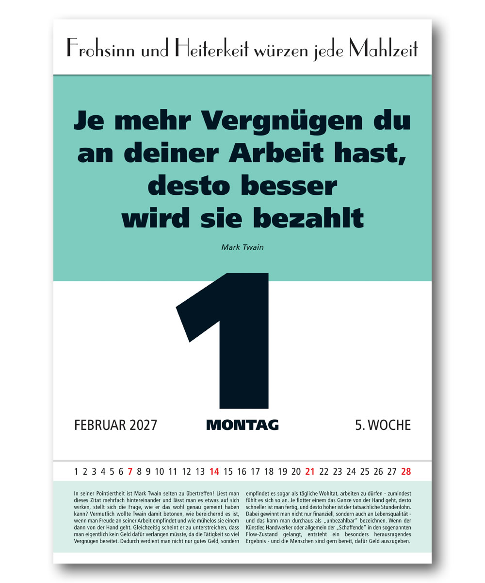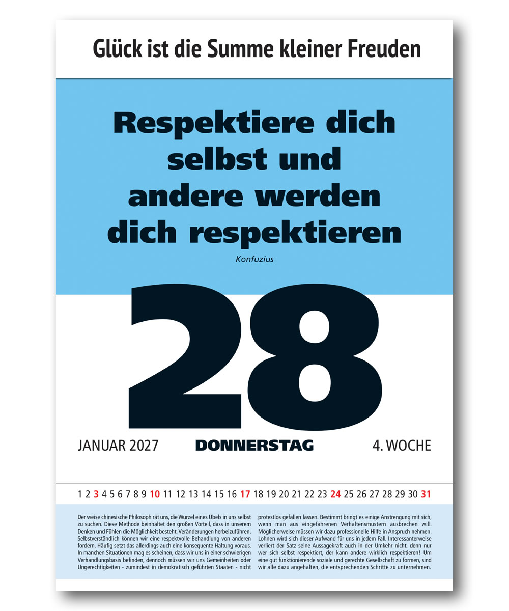Wie muss ich leben, um im Einklang mit mir selbst und der Welt zu sein? Wie behalte ich in jeder Lebenslage Orientierung und Durchblick? Seit der Antike sind Literatur und Philosophie auf der Suche nach der Kunst des richtigen Lebens. Oft sind es dabei kleine Gedanken, die uns um tiefste Erkenntnisse über die Welt und uns selbst bereichern. Der Impulskalender versammelt die schönsten und klügsten Antworten auf die zentralen Fragen des Lebens. Zum Teil mit über 300 anregenden Weltweisheiten, je nach Kalendertyp. Tagesspruch gewünscht? Dann wählen Sie den Tages-Kalender. Wenn Ihnen das zu viel ist, dann wählen Sie den Wochen-, 3-Monats-, oder den neuen 4-Monatskalender. Hier finden Sie schnell den passenden Begleiter, für sich und andere. Und das schon ab 23 Cent am Tag! Dieser Aphorismen-Kalender ist das perfekte Geschenk für Verwandte, Freunde und Geschäftspartner, die das Besondere suchen und zu schätzen wissen. Mit diesem besonderen Geschenk machen Sie alles richtig. Erleben Sie pure Freude, und gewinnen Sie Freunde!